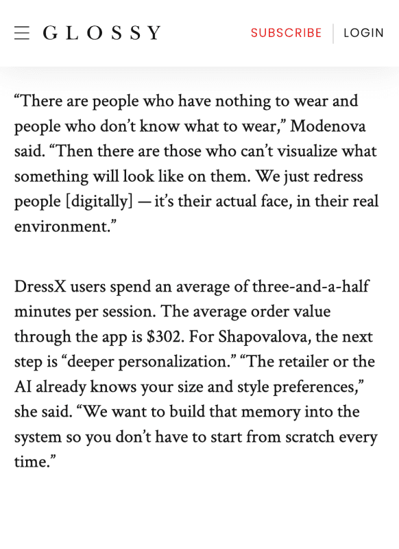 The DRESSX Virtual Try-On was designed to strengthen customer confidence and support purchase decisions giving shoppers assurance in their choices and reducing hesitation to buy. With up to 75% certainty in fit, conversion rates go up and return rates drop significantly.