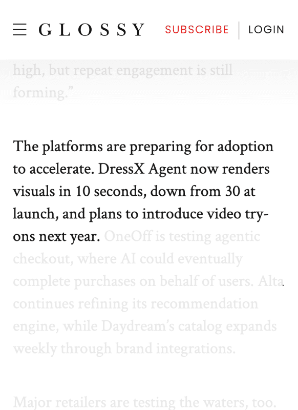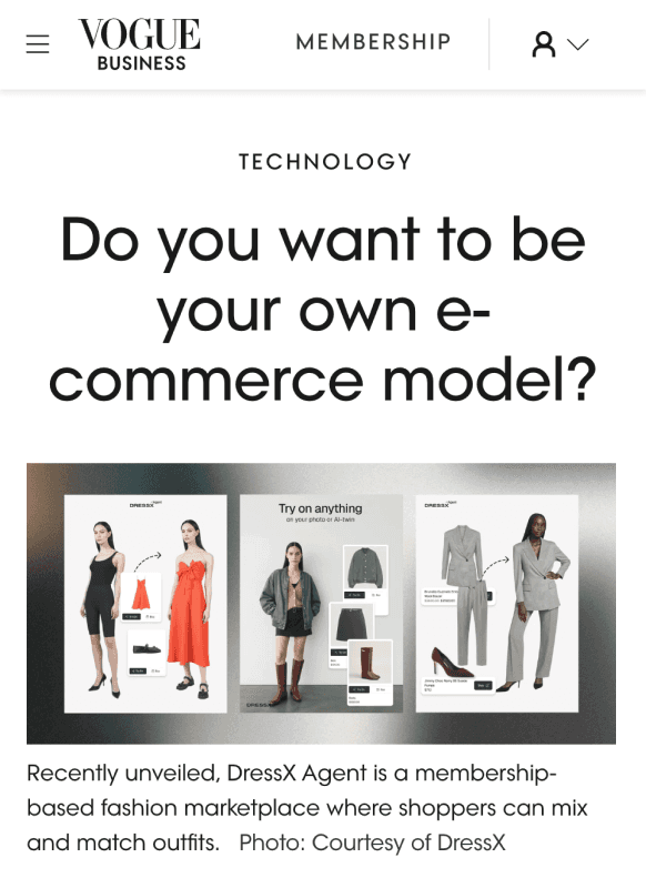 The platform is open to everyone, but it also includes an exclusive membership community. Members get access to advanced features and exclusive offers. Reach out to us if you are interested in being onboarded onto DRESSX Agent. There are no integration fees, and all partnerships are based on a CPA model.